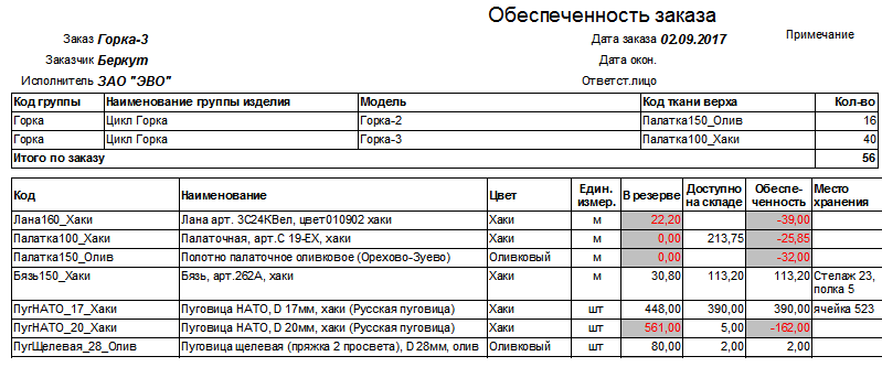 Программа рассчитывает потребность в материалах и фурнитуре для выполнения заказа и проверяет наличие их на складе. Если есть все необходимое для выполнения заказа, то его запускают в производство