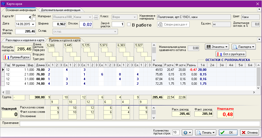 В картах кроя фиксируются сведения о раскроенных настилах и использованных рулонах, а также о материалах, которые подлежат возврату на склад