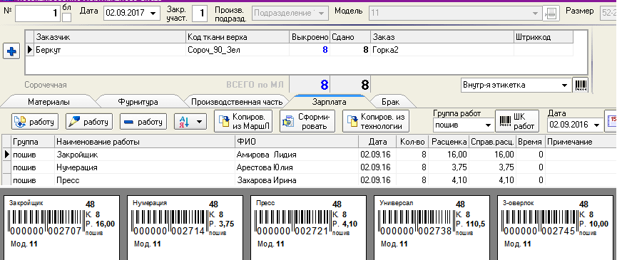 Предоставлена возможность учета выполненных швеями работ с применением технологии штрихового кодирования операций. Это позволяет сформировать данные о выполненных работах и автоматически рассчитать размер заработной платы